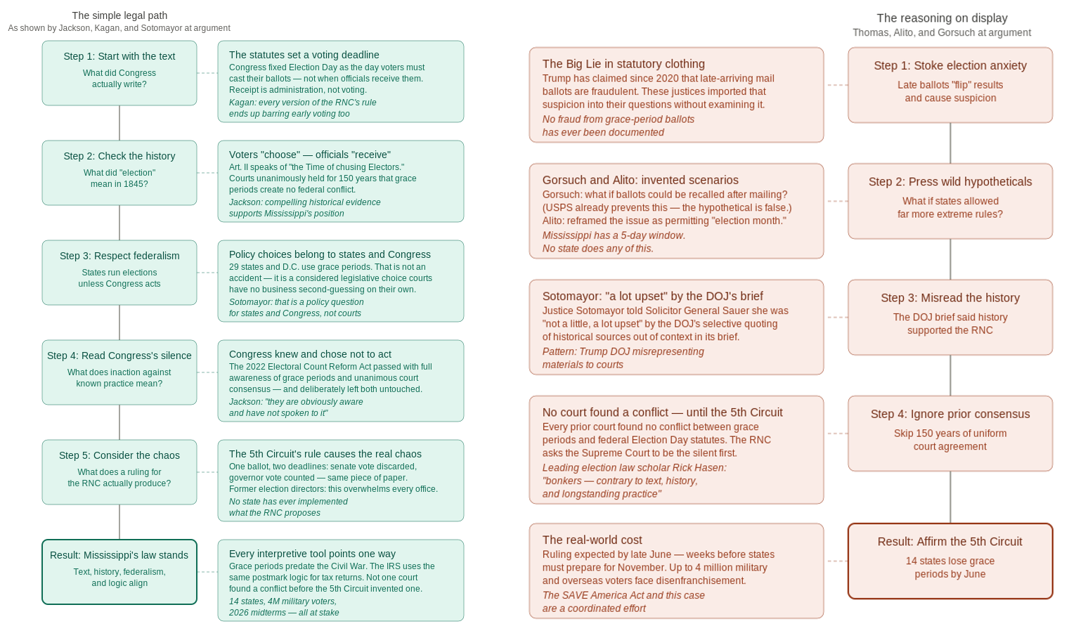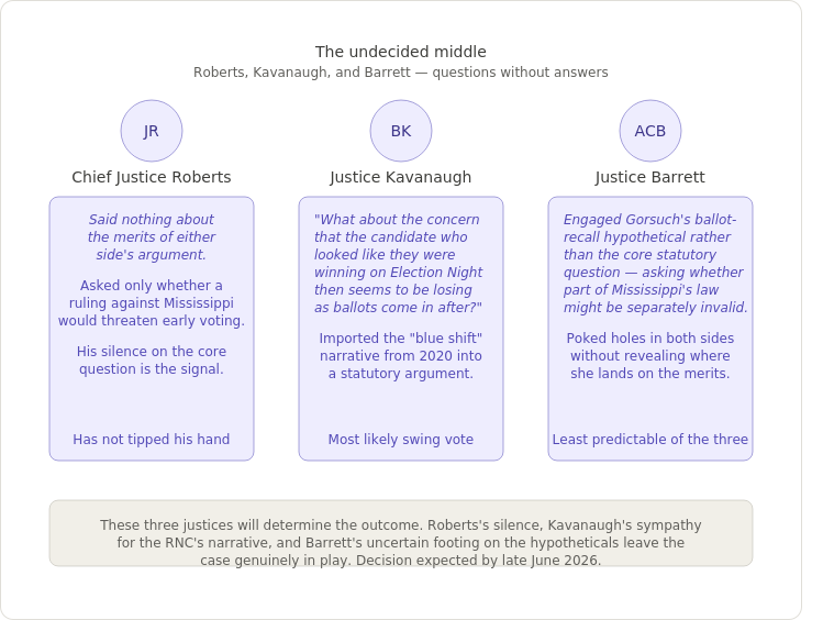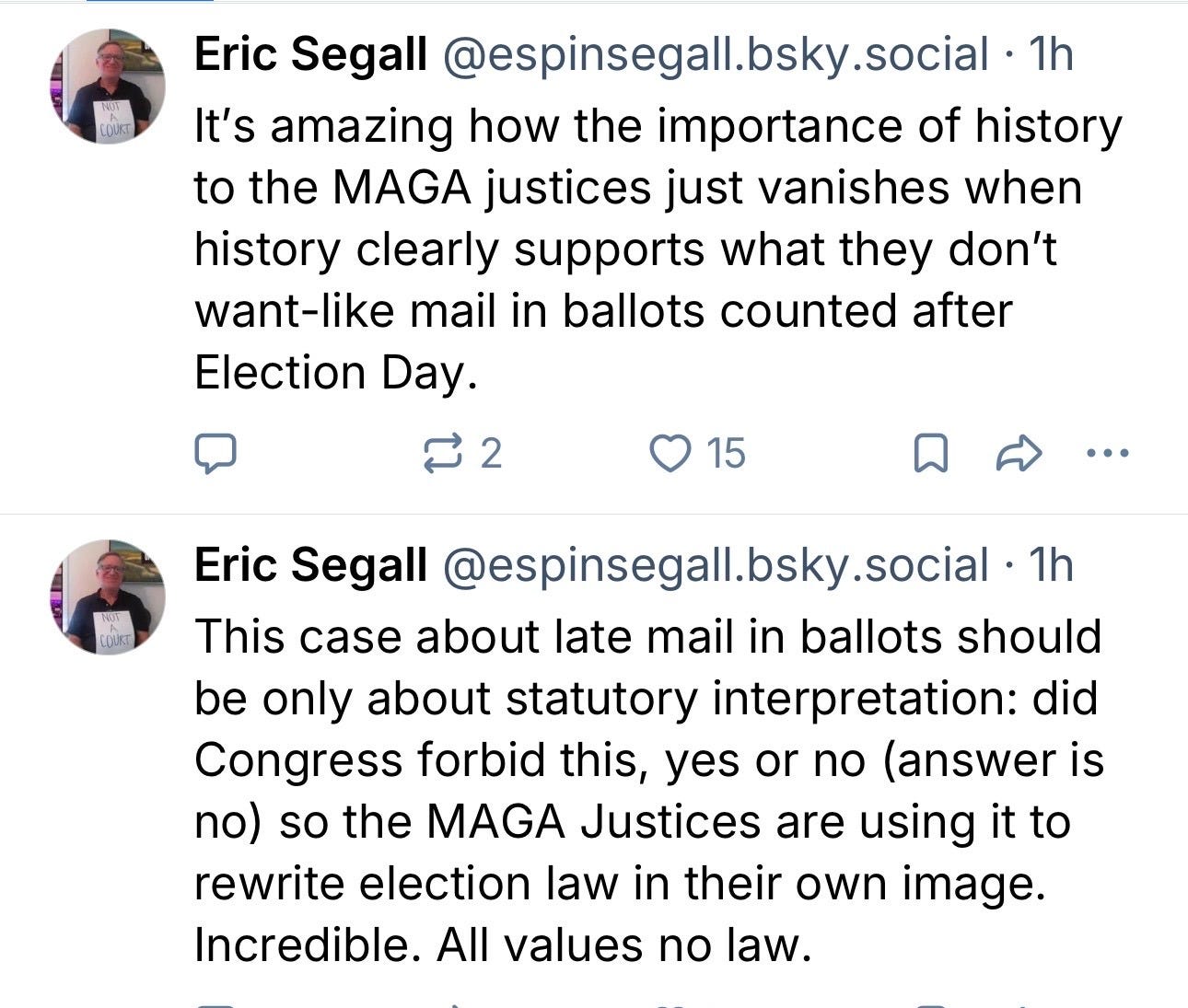 Yesterday, the Supreme Court heard oral argument in Watson v. Republican National Committee — a case about whether federal law requires mail-in ballots to be received by Election Day, or only cast by it. Mississippi allows a five-day grace period for timely-mailed ballots. A ruling against Mississippi could end similar practices everywhere, affecting 14 states directly (and another 15 states to a lesser extent), stripping protection from millions of voters, and landing weeks before states must prepare for the 2026 midterm elections. To provide you with a bit of introductory flavor, here are two entirely on-target posts from Georgia State Law Professor Eric Segall during the oral argument.